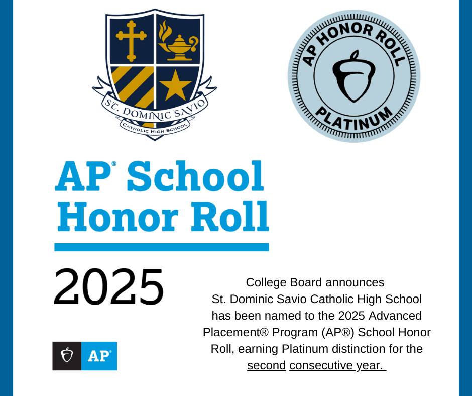 St. Dominic Savio Catholic High School is proud to announce that our faculty, staff, and students have once again earned Platinum status on the 2025 AP School Honor Roll, marking the second consecutive year Savio has achieved this prestigious distinction. This recognition represents the highest level on the AP School Honor Roll and reflects our continued commitment to academic excellence and student achievement. During the most recent reporting year, our school earned Platinum status by meeting the following benchmarks: